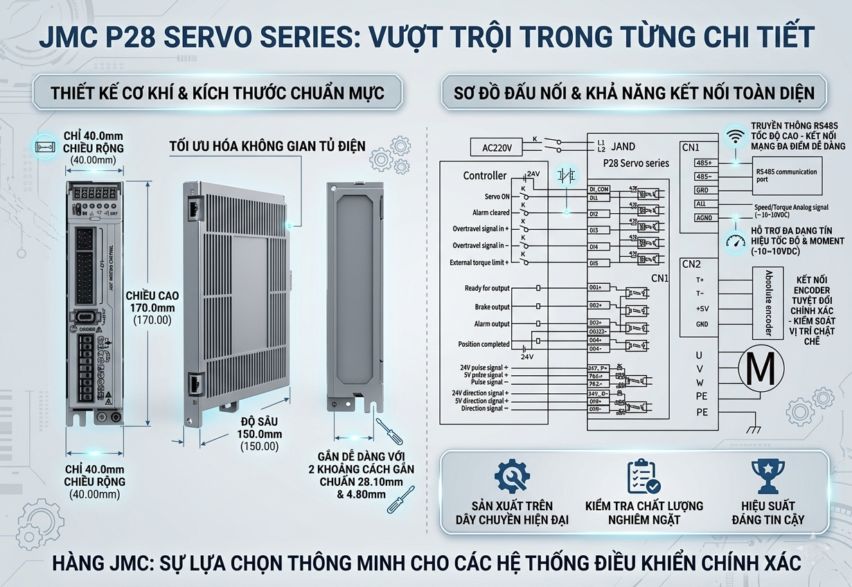 Tối ưu không gian: Kích thước Drive JMC và Motor JMC nhỏ gọn, dễ dàng lắp đặt vào tủ điện có diện tích hạn chế.